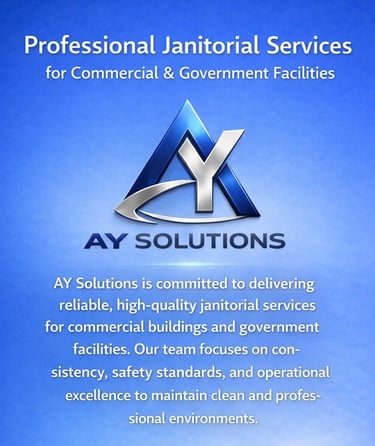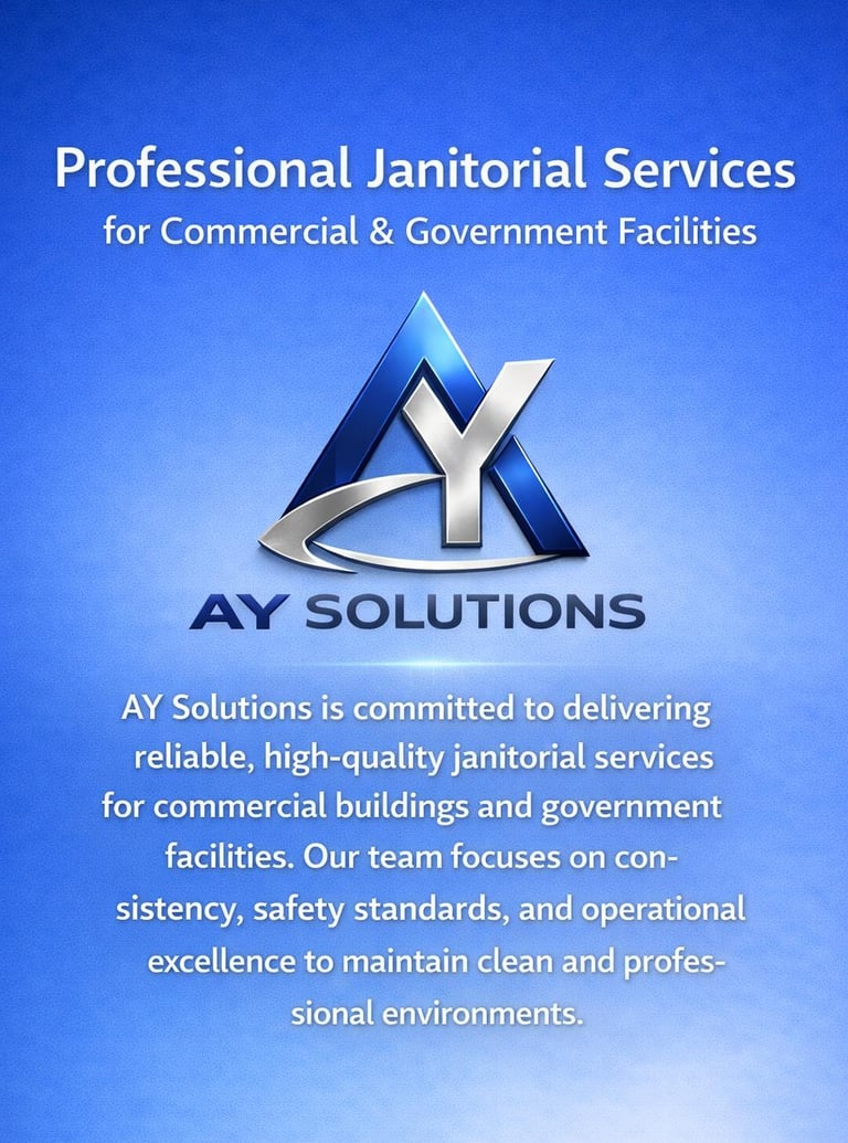 "AY Solutions delivers professional janitorial and facility cleaning services for commercial buildings, offices, and government facilities. Our team is committed to operational excellence, safety standards, and consistent service quality. We provide reliable cleaning solutions designed to support productive and well-maintained environments."